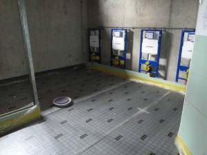 Die Toilettenanlage mit verlegten Fußbodenheizungsleitungen auf der Dämmung.