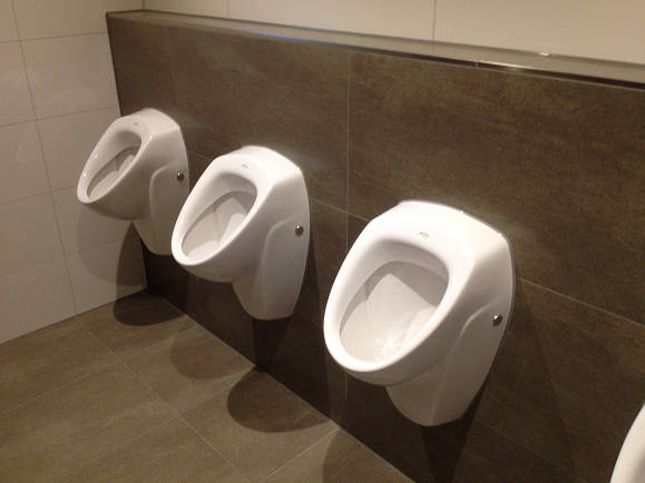 Die fertig montierten Toilettenanlage Links Urinalanlage, Rechts Herren WC
