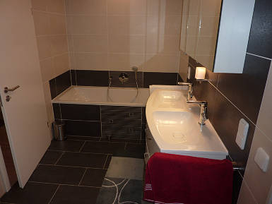 Badsanierung Ein echtes Spaßbad mit bodengleicher Dusche, Badewanne und viel Platz auf vergleichsweise geringer Fläche.